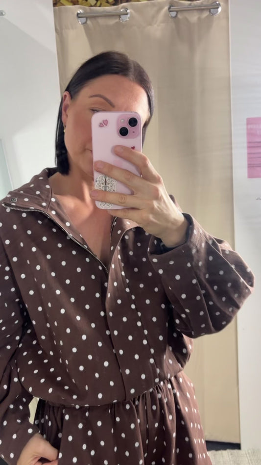 Funnel Neck Jacket & Matching Shorts Set - Brown Polka Dot