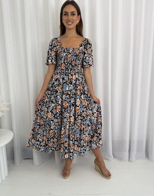 Clara Shirred Bust Tie Back Midi Dress - Navy Floral