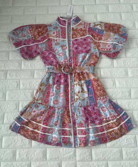 Demi Short Sleeve Button Up Belted Mini Dress - Patchwork