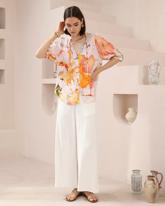 Emma Button Up Short Sleeve Shirt Top - White Pink Floral