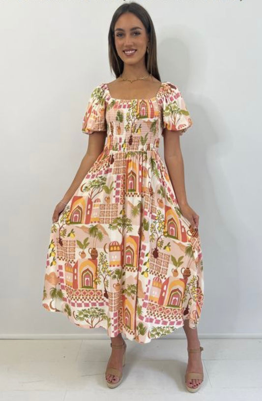 Alysia Shirred Bust Midi Dress - Brown Floral