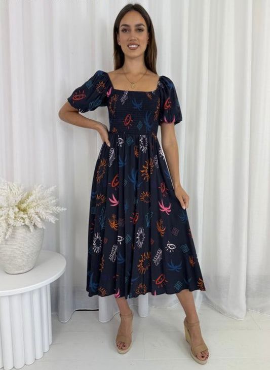 Alysia Shirred Bust Midi Dress - Black Evil Eye