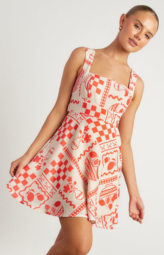 Harriet Tie Back Detail Mini Dress - Red Stamp Print