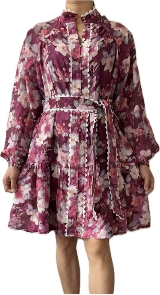 Jordana Button Up Belted Mini Dress - Purple Floral