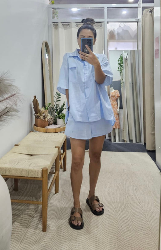 Maria Open Back Button Up Shirt & Shorts Set - Blue | By Frankie