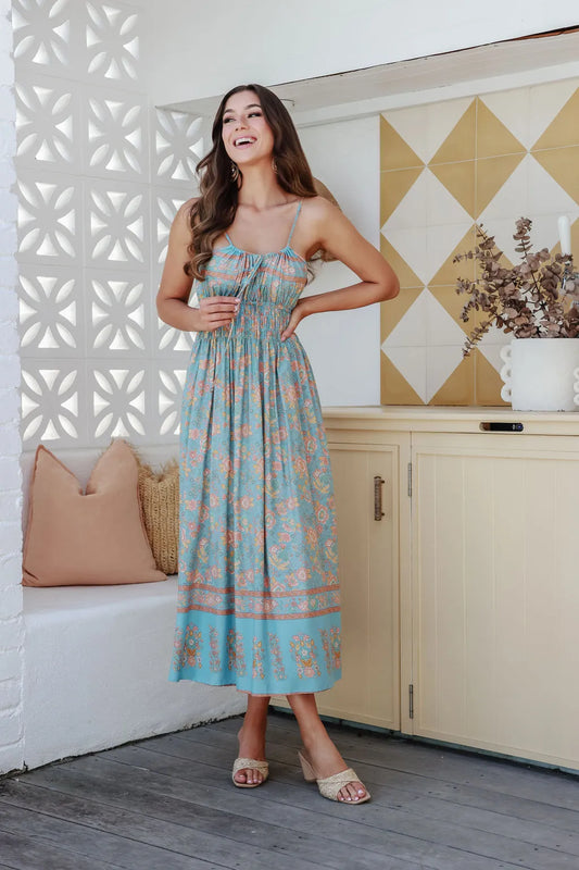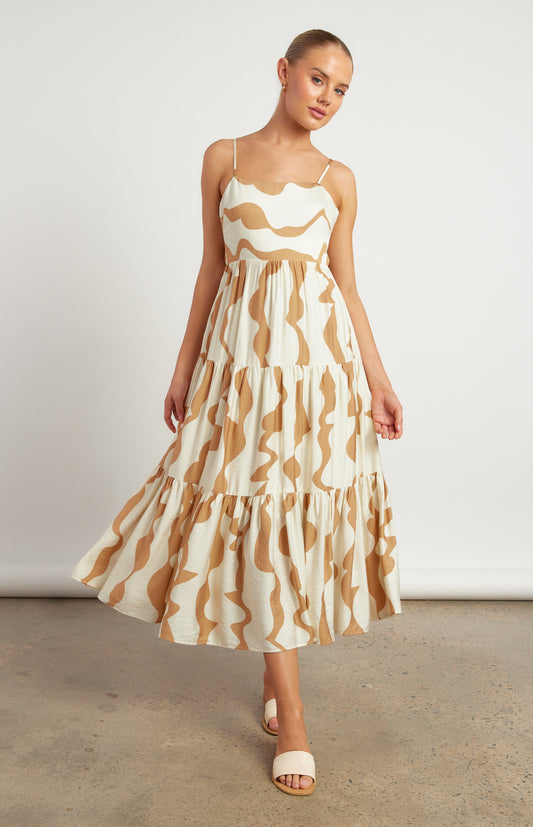 Morgan Wave Print Tiered Midi Dress with Tie Back Detail