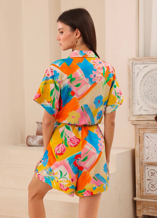 Ariana Collared Belted Button Up Playsuit - Fluro Floral