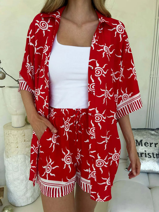 ARIA MATCHING SHIRT & SHORTS SET - SUNBURST RED PRINT