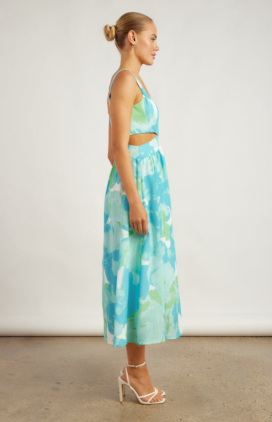 Astrid Abstract Print Faux Linen Midi Dress Waist Cut Outs - Blue
