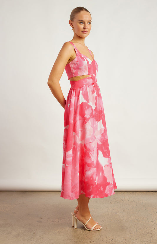 Astrid Abstract Print Faux Linen Midi Dress Waist Cut Outs - Pink