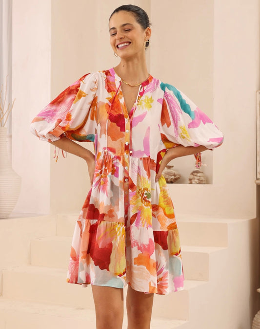 Poppy Short Sleeve Button Up Mini Dress - White Pink Floral
