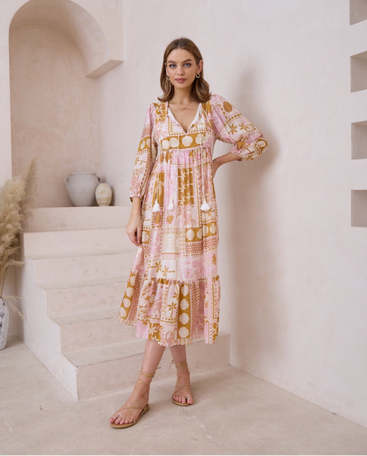 Shelly Boho Half Sleeve Midi Dress - Pink