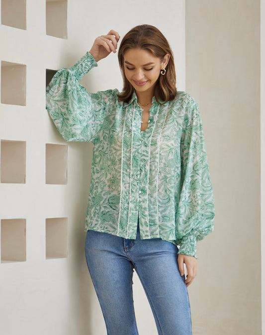 Susan Button Up Long Sleeve Shirt - Green Floral