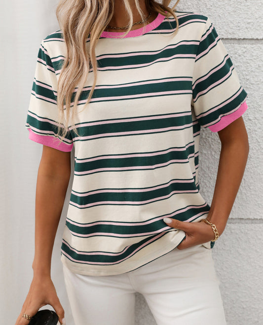 Trish Contrast Trims Stripe Tee Shirt - Green Pink