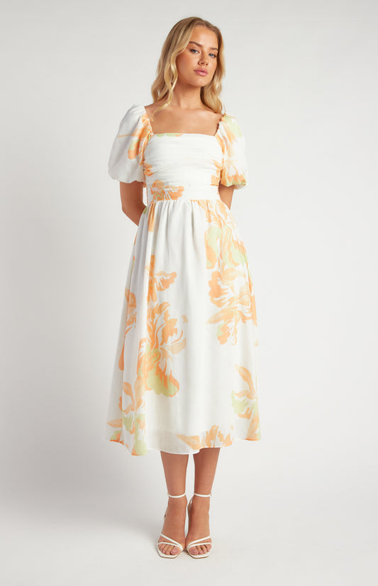 Tracey Pleated Bodice Floral Print Midi Dress - Orange White