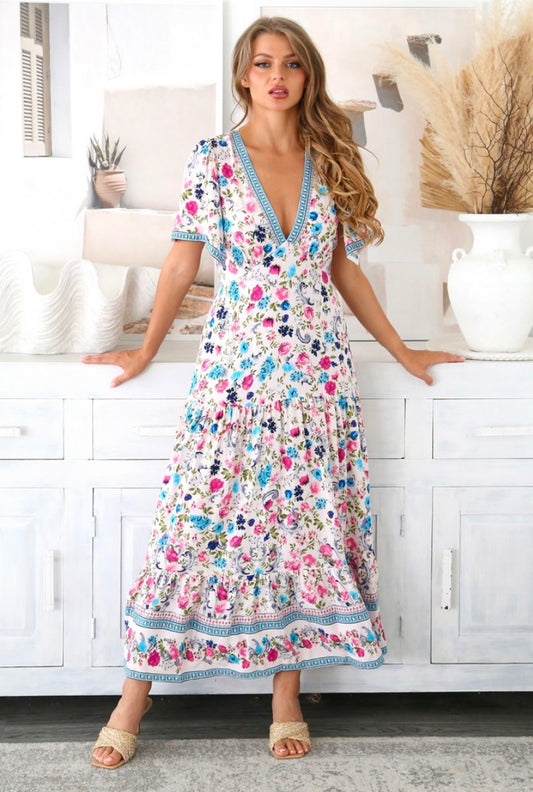 Zoe Button Up Long Sleeve Midi Dress - Blue Pink Floral