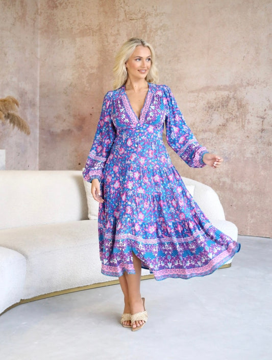 Zoe Button Up Long Sleeve Midi Dress - Blue Purple Floral