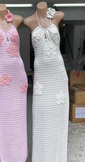 Adeline Halter Floral Crochet Knit Long Maxi Dress - White | By Frankie