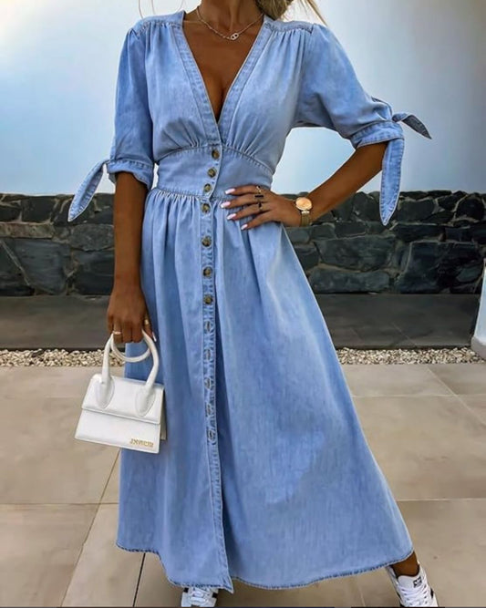 Alley V-Neck Button Front Midi Denim Dress - Blue