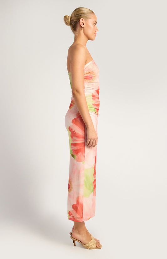 Brooke Contrast Floral Print Strapless Mesh Midi Dress - Coral Green