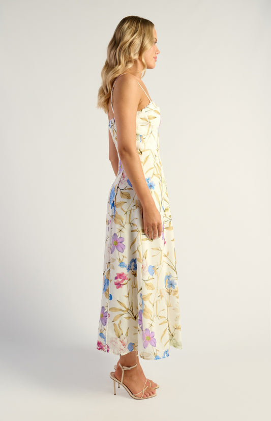 Botanica Floral Faux Linen Bust Detail Midi Dress - Cream Blue