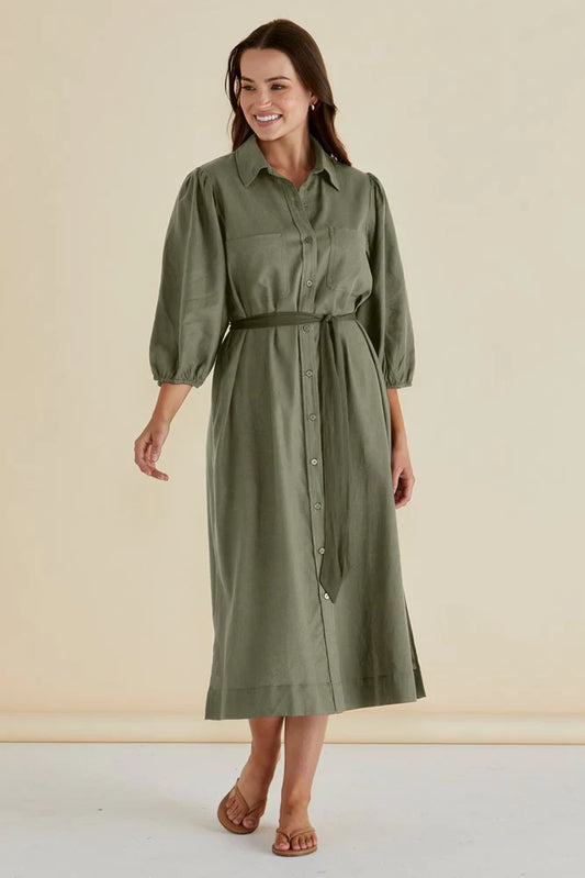 Angelina Button Up Midi Dress - Olive Green