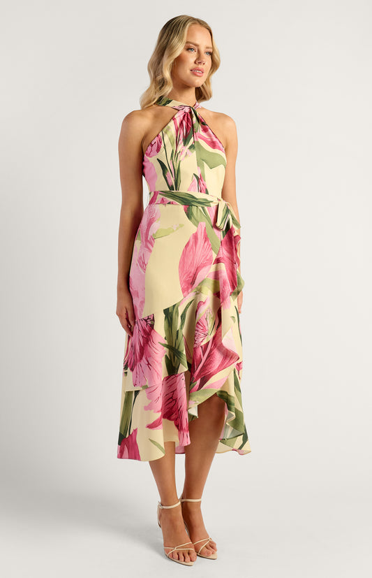 Tara Floral Print Halter Dress With Waterfall Hem - Oasis Lemon
