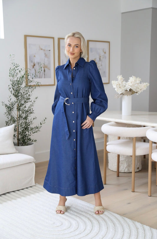 Gina Button Up Belted Maxi Dress - Blue Denim