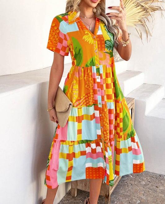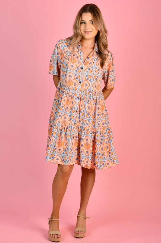 Victoria Short Sleeve Button Up Dress - Lemon Tile Blue/Pink
