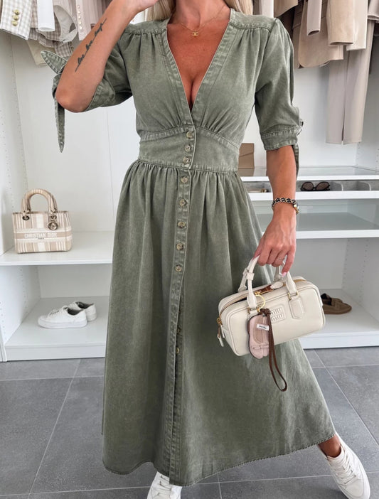 Alley V-Neck Button Front Midi Denim Dress - Sage