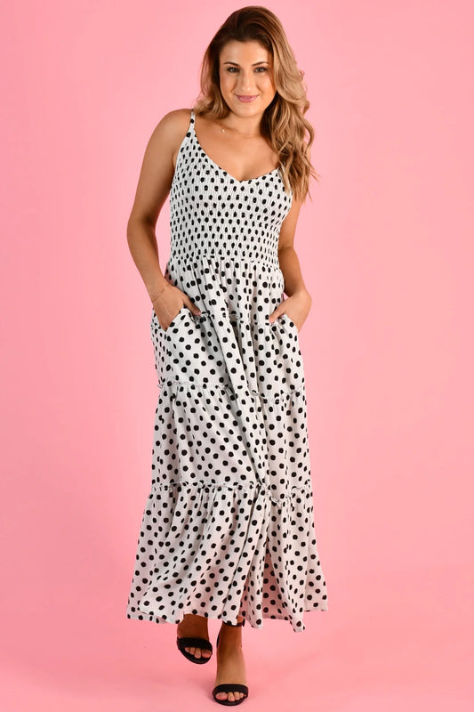 Jolene Shirred Bust Maxi Dress - Polka Dot Black