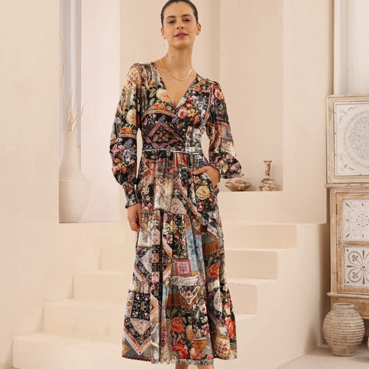 Avah Long Sleeve V-Neck Midi Dress - Vintage Angel Black
