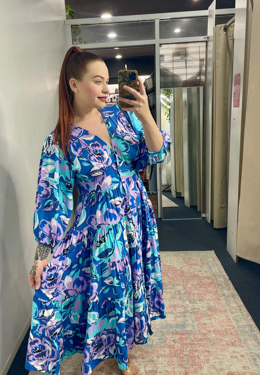 Zoe Button Up Long Sleeve Midi Dress - Blue Purple Floral
