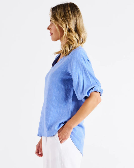 Elanora V-Neck Linen Blouse - Berry Blue Stripe