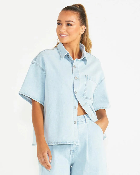 KATRINA BOYFRIEND BUTTON UP DENIM SHIRT TOP - LIGHT BLUE SNOW WASH