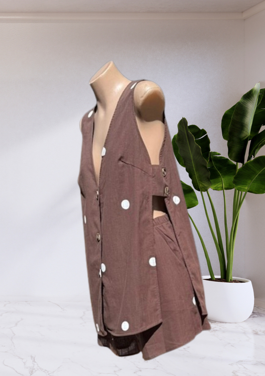 Milly Polka Dot Button Up Open Vest Shirt & Shorts Set - Chocolate Brown | By Frankie