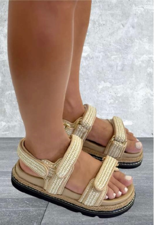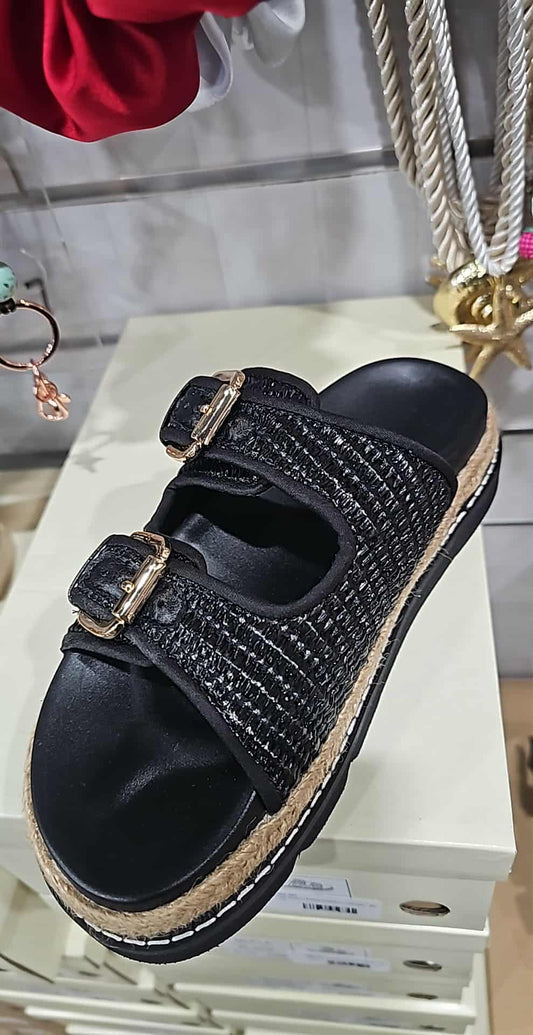 Maple Double Buckle Raffia Platform Sandal Shoes - Black