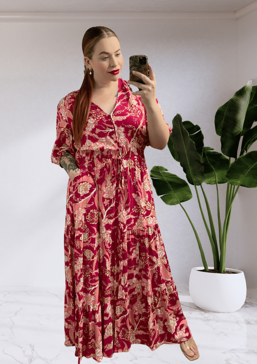 Adeline Boho 1/2 Sleeves Maxi Dress - Red Floral
