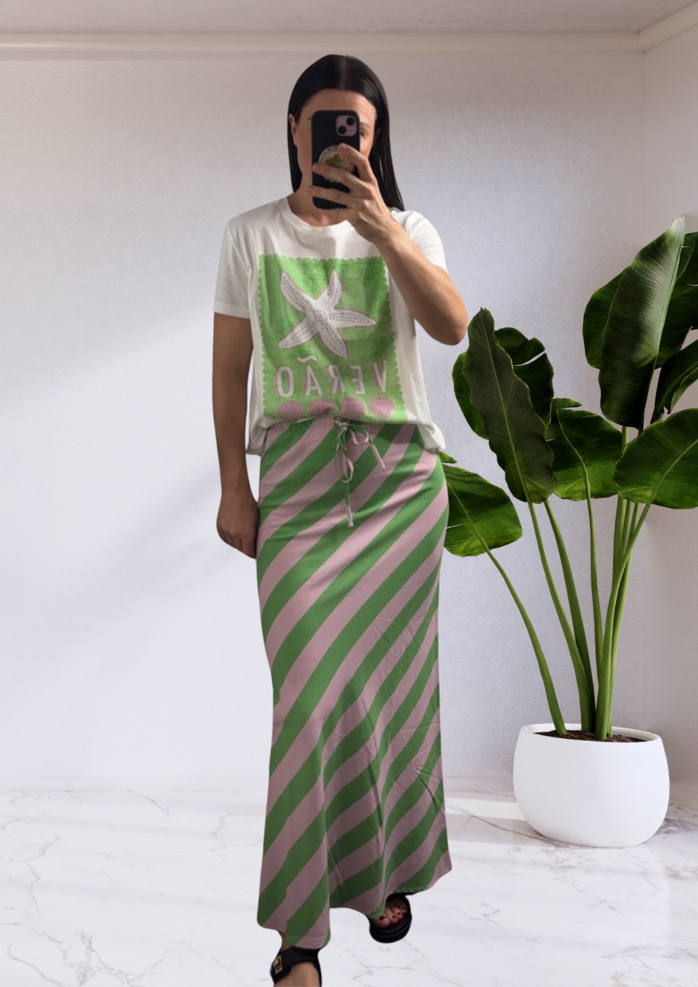 Brooke Bias Midi Skirt in Green/Pink Stripe