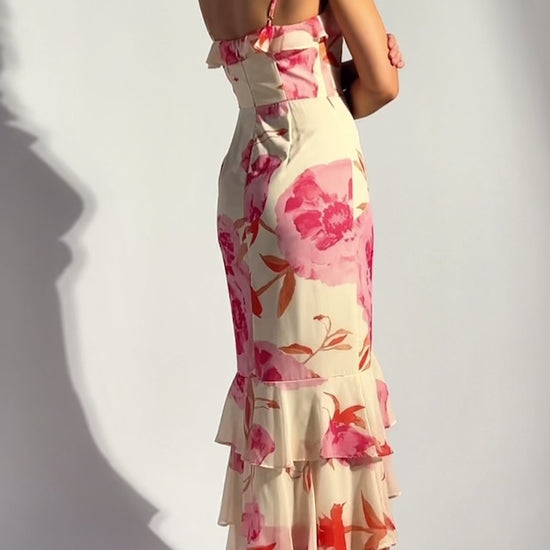 Cara Floral Chiffon Frill Neckline Tiered Hem Maxi Dress - Pink