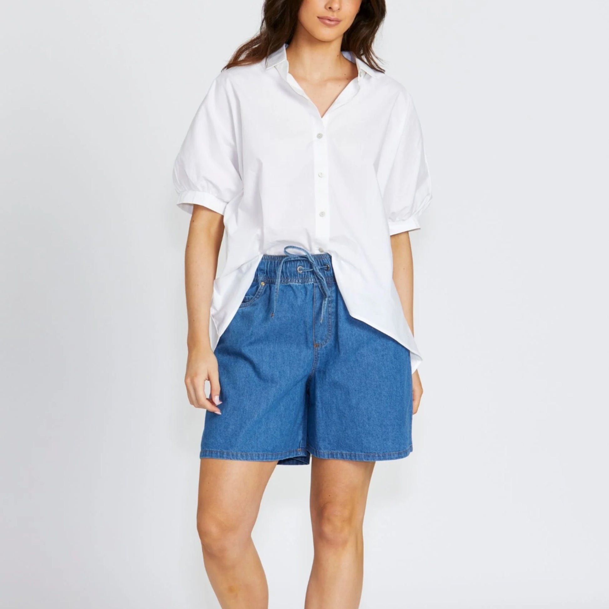 Relaxed-fit shorts in lightweight cotton denim with a comfortable elastic waistband and practical side pockets. The Cleo Short is an easy option for warm days, pairing well with everything from tanks to oversized shirts.