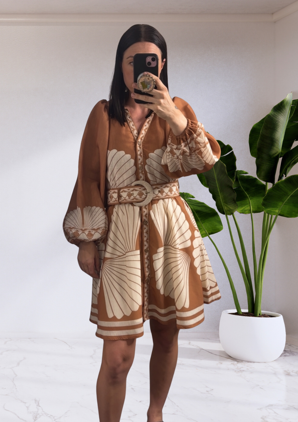 Donatella Button Up belted Mini Dress - Brown Siena Shell